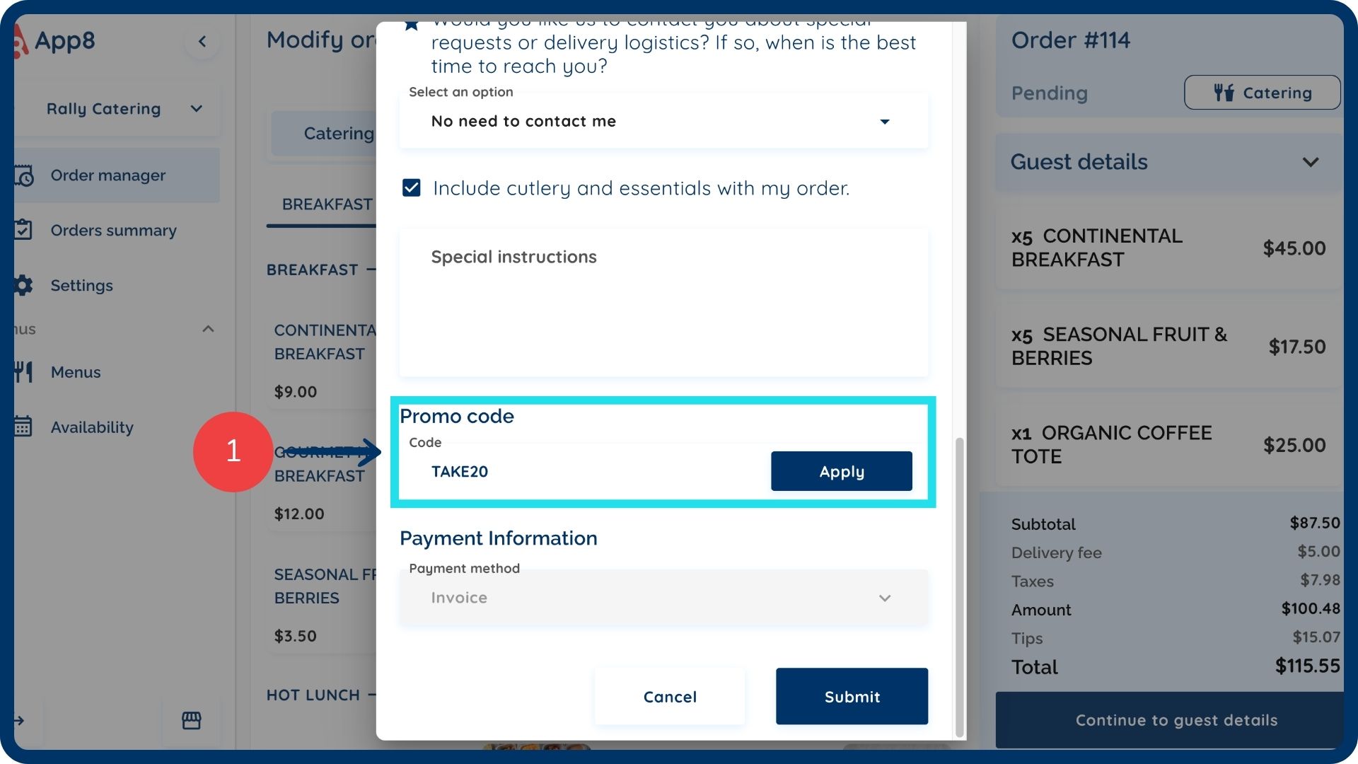 If promo codes are enabled on your menu, you can apply a promo code to the order on the guest details page.